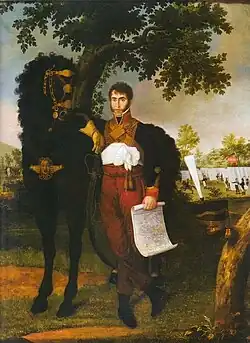 In 1805 Montúfar moved to Madrid, Spain to begin his military training at the Royal Academy of Nobles.[11] He fought against the Napoleonic army in the Peninsular War, serving as aide-de-camp to General Francisco Javier Castaños in the Battle of Bailén in 1808, considered Napoleon's first military defeat.[12] He was appointed in Cádiz by the Supreme Central Board as royal commissioner for the Court of Quito, with broad autonomy from the viceroys of Peru and New Granada.[13]
