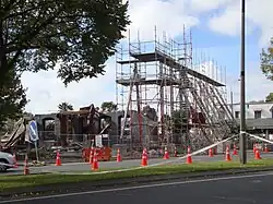 Carlton Hotel suffered damage in the 2010 Canterbury earthquake, but remained open. It was heavily damaged in the subsequent earthquake on 22 February 2011, when part of the façade facing Papanui Road collapsed. Engineers found that the building was prone to failure in another strong aftershock, and it was demolished on 9 April 2011.[5][6] The building's owner has replaced the building with a modern structure,[7] but the new complex has been criticised as "unsympathetic".[8]