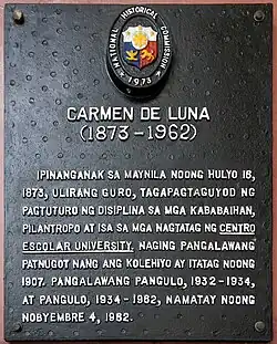 Carmen de Luna Villajuan (July 16, 1873 – November 4, 1962) was a Filipina educator and co-founded the Centro Escolar University. After completing her own education to train as a teacher, de Luna taught at the private school run by Librada Avelino in Manila and the Pandacan Public Girls' School. In 1907, the two women, along with Fernando Salas founded the Centro Escolar de Señoritas, as a non-sectarian educational facility for girls. Acting as assistant director from 1907 to 1934, she assumed the directorship upon Avelido's death and led the university until her own death in 1962.