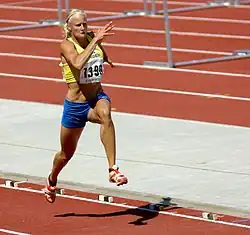 Carolina Evelyn Klüft (Swedish pronunciation: [ˈklʏfːt]; born 2 February 1983) is a retired Swedish track and field athlete who competed in the heptathlon, pentathlon, long jump and triple jump. She was an Olympic Champion, having won the heptathlon title in 2004. She was also a three-time World heptathlon champion, World Indoor pentathlon champion, a two-time European heptathlon champion and a two-time European Indoor pentathlon champion. Klüft is the only athlete ever to win three consecutive world titles in the heptathlon (2003, 2005, 2007). She was unbeaten in 22 heptathlon and pentathlon competitions from 2002 to 2007, her entire combined events career as a senior athlete, winning nine consecutive gold medals in major championships.[1]