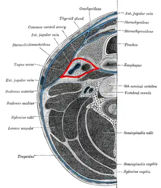 : CS1 maint: location missing publisher (link) - ^ a b c d e f g h i j k l m n o p Garner, Darren H.; Kortz, Michael W.; Baker, Stephen (2022), "Anatomy, Head and Neck, Carotid Sheath", StatPearls, Treasure Island (FL): StatPearls Publishing, PMID 30137861, retrieved 2022-12-27