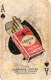 ![]() Vintage Craven "A" branded playing card, a brand of Carreras Tobacco Company (This can be dated to post-1928, as it mentions the Arcadia Works). | |