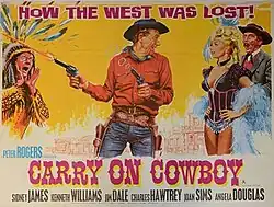 Carry On Cowboy is a 1965 British comedy Western film, the eleventh in the series of 31 Carry On films (1958–1992).[1][2] It was the first film to feature series regulars Peter Butterworth and Bernard Bresslaw. Series regulars Sid James, Kenneth Williams, Jim Dale, Charles Hawtrey and Joan Sims all feature, and Angela Douglas makes the first of her four appearances in the series.[3] Kenneth Williams, usually highly critical of all the Carry on films he appeared in, called the film "a success on every level" in his diary, taking pride in its humour and pathos.[4] The film was followed by Carry On Screaming! (1966).