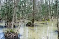 Carska Droga acts as a hydrological barrier, limiting the flow of water from the eastern to the western part of the Ławki swamp in Biebrza National Park. Its embankment has caused the groundwater table to rise in the east, leading to the development of mossy areas.[24]