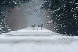 Carska Droga within the park's buffer zone is attractive for its natural qualities due to the absence of buildings, billboards, human presence, minimal tourist traffic and signage, and a variety of landscapes.[23] The deteriorated asphalt surface of the still-unrepaired road prevents excessive speeds.[7][9] It attracts a large number of nature enthusiasts and birdwatchers.[8] Moose are frequently seen here,[8][15][19] and wolves can also be spotted, along with rare bird species. Osowiec Fortress is one of the largest bat wintering sites in Poland.[21]