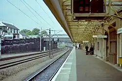 The route through the station was electrified in the 1974 electrification scheme that covered the West Coast Main Line between Weaver Junction and Glasgow Central. As part of this the station was re-signalled, with the original mechanical signal box being removed and the junction now being controlled remotely from a new power signal box at Motherwell. The critical point was the connection from Edinburgh on a minimum radius curve to provide a connection into the Down platform whilst avoiding the installation of a diamond crossing. The provision of superelevation through the Up platform for 90 mph (145 km/h) running required deep ballasting; this required the platform to be raised. The original station buildings were being retained, and continuous railings were provided to prevent passengers accidentally falling down from one level to the other.[12] This height difference has now been removed as the original station buildings were demolished and replaced with a more modern alternative and the entire platform was levelled off. The only remnant of the original station buildings was the integral footbridge, now adapted as a stand-alone structure.