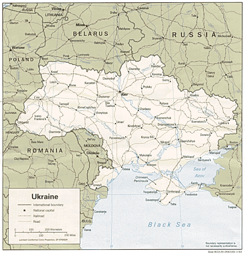 1993 | Ukraine Map (Political) 1993 | Ukraine Map (Political) 1993 | Central Intelligence Agency | All toponyms within Ukraine were derived from Ukrainian endonyms, except that of the capital city of Kyiv, which was still rendered Kiev. | ![]() |