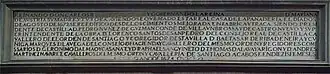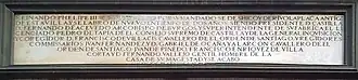 Reinando Felipe II y por su mandado se deshizo y derribó la plaza antigua de esta villa y se labró de nuevo en tiempo de dos años, siendo Presidente de Castilla Don Fernando de Acebedo Arzobispo de Burgos y superintendente de Castilla el licenciado Pedro de Tapia del Supremo Consejo de Castilla y de la general Inquisición y Corregidor Don Francisco de Villacís caballero de la Orden de Santiago y Regidores Comisarios Juan Fernández y Don Gabriel de Ocaña de Alarcón caballero de la Orden de Santiago, Juan de Piñedo, Francisco Enríquez de Villacorta y Don Fernando Vallejo Gentil Hombre de la casa de Su Majestad u se acabó en el año 1619. | Reinando Don Carlos II y gobernando la Reina Doña Mariana de Austria su madre y tutora, habiéndose quemado esta Real Casa de la Panadería el día dos de agosto de 1672, se reedificó desde los cimientos mejorada en fábrica y traza siendo Presidente de Castilla Pedro Nuñez de Guzmán Conde de Villaumbrosa y Castronuevo y superintendente de la obra Don Lorenzo Santos de San Pedro del Consejo Real de Castilla, caballero de la Orden de Santiago, y Corregidor de esta villa Don Baltasar de Rivadeneira y Cuñiga Marques de la Vega del Consejo de hacienda y caballero de la misma orden y Regidores Comisarios Don Gerónimo Dalmao y Casanaey y Rafael San Guineto Don Tomás de Álava y Arigón y Don Andrés Martínez Navarite caballeros del mismo Orden y Caballería de Santiago. Acabose en diecisiete meses. Año de 1674. |