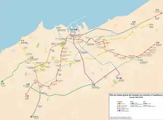 The Schéma directeur d'aménagement urbain (SDAU, "Master plan of the Director of urban planning")[10] and the Plan de déplacement urbain (PDU, "Urban transport plan")[11] for Greater Casablanca foresee a final network of 4 tramway lines, two traversal (T1, T2) and two radial (T3, T4). These lines will interchange with the now cancelled Casablanca Metro and the operational Al Bidaoui suburban railways.[10][11] Casablanca will have a network totalling 76 route km (47+1⁄4 route mi), costing 5.9 billion dirhams.[30]