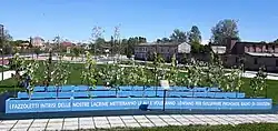 Memorial to asbestos victims on the former Eternit factory site. There is written: "The handkerchiefs soaked in our tears will put on wings and fly far to develop deep roots of justice".