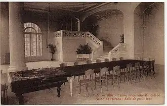 The Casino Internacional Tibidabo was a resort created in 1909 in Barcelona on the Tibidabo mountain.[1] The building had a gaming room, theatre, and bar. The games of chance offered were klondyke, roulette and baccarat. Although gambling was forbidden by law in Spain, the casino operated for three years until the government closed it down in 1912. Today the casino is part of an amusement park. The automatons museum occupies the premises of the old theatre.
