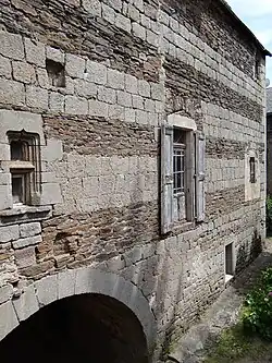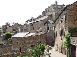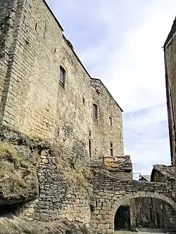 A castle was built on this strategic rock in the 8th century. It was rebuilt in the 11th century. The south wall of the keep was the strongest with the principal vaulted rooms and two square corner towers. A grand staircase was placed to the north in the 18th century. A 15th century entrance gate displays the coat-of-arms of the two families. Also at this time two wings were added conserving the appearance of a fortress. The core of the village was protected by defensive walls which are mainly intact. 44°07′47″N 2°55′57″E / 44.12961°N 2.93252°E[5]