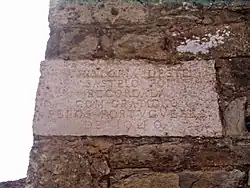 The wall outcroppings on the western, and northwestern exposures show elements of barbicans, that extend one metre in height. There is one unique opening in the northeast, which provides access to the schist cliffs. The towers are massive, distinct in form and incomplete: the north tower is circular, with a diameter of 4.99 metres (16.4 ft) and 9 metres (30 ft) exterior height; the rectangular southern tower, 4.98 metres (16.3 ft) by 4.40 metres (14.4 ft) has the same height as its northern neighbour.[2] In the parade ground, there are several excavations encountered along the northwest walls. This includes the rounded cistern, with vaulted ceiling and interior completed filled-in. Near the entrance, is a commemorative inscription that marks the 100-year period of the castle's restoration.[2]