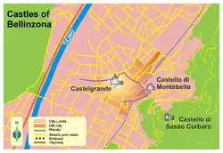 ![]() ![]() Location of Castles of Bellinzona in Canton of Ticino ![]() ![]() Castles of Bellinzona (Switzerland) |