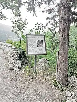It depicts the Abruzzo village of Castrovalva, which lies at the top of a sheer slope. The perspective is toward the northwest, from the narrow trail on the left which, at the point from which this view is seen, makes a hairpin turn to the right, descending to the valley. In the foreground at the side of the trail, there are several flowering plants, grasses, ferns, a beetle and a snail. In the expansive valley below there are cultivated fields and two more towns, the nearest of which is Anversa degli Abruzzi, with Casale in the distance.