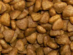Dry food (8–10% moisture) is generally made by extrusion cooking under high heat and pressure. Approximately 95% of dry pet foods are extruded.[21] During this process, the meat is first ground up, cooked under very high heat, and processed so it becomes a powder. The powder is fed into a massive mixer. In the mixer, additional supplements are added; then it's cooked again at very high heat to turn it into a dough, which is molded in the shape of kibble, and baked. At this point, it no longer smells like meat. Fat may be sprayed[22] on the food afterwards to increase palatability, as well as other minor ingredients, such as heat-sensitive vitamins, which would be destroyed in the extrusion process.[23] Dry food is most often packed in multi-wall paper bags, sometimes with a plastic film layer; similar bag styles with film laminates or coextrusions are also used.