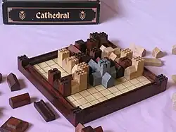 Cathedral, also known as Cathedral: The Game of the Mediaeval City, is a two-player abstract strategy game designed by Robert Moore and first published in 1979, in which dark and light factions vie for territorial supremacy within the bounds of a medieval city. Players play pieces to capture territory on a game board, attempting to place all or most of their game pieces while preventing their opponent from doing likewise. The game's copyright is currently owned by Chrisbo I.P. Holdings Limited in New Zealand.[1]