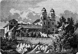 In 1745, Marszałek Kazimierz Oskierka started the construction of a new stone Bernardinian monastery that was planned to have a big church in its center. The exact period of construction is unknown. Most probably, the church was consecrated in the 1760s or in the 1770s. It was a three-nave basilica with two towers, decorated in baroque style. The Oskierks were buried in the crypt. The monastery also had a library and a primary school.[1]