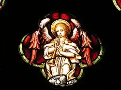 - A rose window that depicts John the Baptist baptizing Jesus with the Holy Spirit above. It is surrounded by eight angels playing instruments.