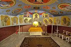 There is a fresco of the Last Supper in the altar room. Next to it is an image of Christ in the Garden of Gethsemane, and the fresco above of Oranta. On the side walls, the council planned the painting of the Three Holy Hierarchs images, St. Stefan and patrons of the Metropolitan of Warsaw: St. George, St. Dionysius, St. Timothy and St. Macarius. Above the entrance was planned a composition showing the birth of Christ, with an iconostasis of Christ the Savior. The project did not represent the entire surface of the walls but included selected images of saints and scenes depicting 12 great feasts of the Orthodox Church.