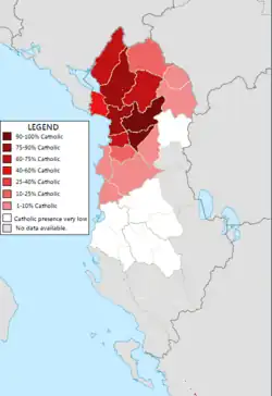 Share of Catholics in Albania per place (2011 census)[11] | ||