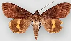 The wingspan is 60–65 mm. The forewings are grayish brown above, with a clearly marked irregular black line running from the leading to the trailing edge both inwards and outwards of each wing's center. The upperside of the hindwings is mainly yellowish orange, with a few dark hairs at the base and a blackish pattern. The latter usually forms two roughly concentric bands, an inner one curving through the mid-wing from the leading to the trailing edge, and an outer one that almost reaches the termen. The apex is outside the outer band and forms a large bright orange-yellow spot; likewise, the outer band does not reach the tornus, which bears a separate black spot. The termen has faint dark bands along the wing veins. The underside of the wings is yellow with black bands. Some forms with aberrant pattern are known. As in many relatives, the foreleg tibia of this species possess no spines, while the tarsi carry three rows of spines.[2]