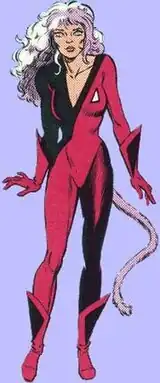 Catseye possesses the ability to transform into a purple cat-like creature and serves as the antithesis of Wolfsbane, who can transform into a wolf.[4] She engages in several battles with the New Mutants—mostly petty competition—but occasionally gets along with the students, becoming friends with Wolfsbane in particular.[3][5][6]