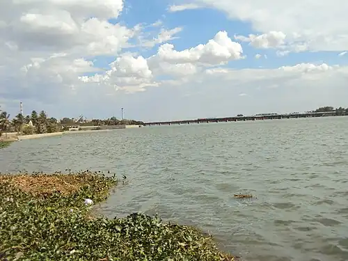 A train cruises over Kaveri river next to the station near Pallipalayam, Tamil Nadu | |||||