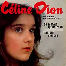 At age 12, Dion collaborated with her mother Thérèse and brother Jacques to write and compose her first song, "Ce n'était qu'un rêve".[1] Dion's brother Michel sent the recording to music manager René Angélil, whose name he discovered on the back of a Ginette Reno album.[1] Angélil was moved by Dion's voice and decided to help her.[1] On 11 June 1981, "Ce n'était qu'un rêve" was released on a 7-inch single.[2] On 19 June 1981, Dion made her first broadcast appearance.[2] She performed "Ce n'était qu'un rêve" in a popular talk show in Quebec, Canada hosted by Michel Jasmin.[2] After releasing the single in Quebec by Les Disques Showbizz in 1981, it was also issued in France by Pathé Records in 1982.
