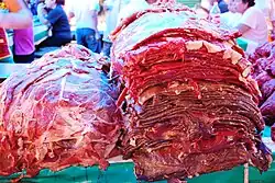 In Mexico, most cecina is of two kinds: sheets of marinated beef, and a pork cut that is sliced or butterflied thin and coated with chili pepper (this type is called cecina enchilada or carne enchilada).[4] The beef version is salted and marinated and laid to dry somewhat in the sun. The marinated beef version can be consumed uncooked, similar to prosciutto. The pork "cecina enchilada" must be cooked before consumption. The town of Yecapixtla is well known for its version of the dish, which varies from region to region.[5]