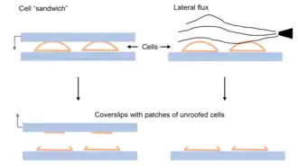 Cell unroofing encompasses various methods used to isolate and expose the cell membrane of cells. Unlike the more common membrane extraction protocols performed with multiple steps of centrifugation (which aims to separate the membrane fraction from a cell lysate), cell unroofing aims to tear and preserve patches of the plasma membrane to perform in situ experiments using microscopy and biomedical spectroscopy.