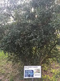Celtis ehrenbergiana, called the desert hackberry or spiny hackberry, is a plant species that has long been called C. pallida by many authors, including in the "Flora of North America" database.[4] It is native to Arizona, Florida, New Mexico and Texas, and to Latin America as far south as central Argentina. It grows in dry locations such as deserts, brushlands, canyons, mesas and grasslands.[5]