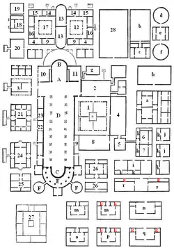Cenobitic monks were also different from their eremitic predecessors and counterparts in their living arrangements. Whereas eremitic monks (hermits) lived alone in a monastery consisting of merely a hut or cave (cell), cenobitic monks lived together in monasteries comprising one or a complex of several buildings. In the latter case, each dwelling would house about twenty monks, and within the house there were separate rooms or cells that would be inhabited by two or three monks.[8] To early generations of historians, the style of housing maintained by cenobitic monks was attributed to the man usually hailed the "father of cenobitic monasticism," Saint Pachomius, who was believed to have found the idea for such quarters during the time he spent in the Roman army, as the style was "reminiscent of army barracks." While this impression may have been to some extent mythologized by the bishop and historian Palladius of Galatia,[9] communal barracks-like desert dwellings known as cenobia came to exist around the early 4th century.[10]: 28