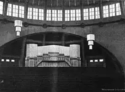 The hall was originally provided with a Sauer pipe organ built by Walcker Orgelbau, which then, with 15,133 pipes and 200 stops, ranked as the world's largest. On 24 September 1913, Karl Straube was the first to play it, performing Max Reger's Introduction, Passacaglia and Fugue, Op. 127, specially composed to celebrate the occasion. Most parts of the organ were transferred to the rebuilt Wrocław Cathedral after World War II.