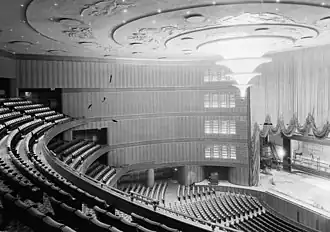After 21 years of operation, the Center Theatre was demolished in 1954 and replaced with a 19-story addition to the U.S. Rubber Company Building. The final production at the theatre was the New York-portion of the 1954 Academy Awards, when Audrey Hepburn won Best Actress for Roman Holiday.[6] During the demolition process, the U.S. Rubber Building above it was put on temporary stilts, with the offices above the former theater still being occupied during the demolition process.[8] Doors, lamps, and other furnishings were sold off to the Cherry Lane Theatre in the West Village.[9] Bob Jones University purchased the stage lifts and turntables from the Center Theatre and reassembled them in its Rodeheaver Auditorium, where the mechanisms are still in use today.[10]