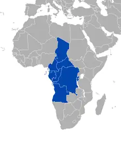 Central Africa (French: Afrique centrale; Spanish: África central; Portuguese: África Central) is a subregion of the African continent comprising various countries according to different definitions. Middle Africa is an analogous term used by the United Nations in its geoscheme for Africa and consists of the following countries: Angola, Cameroon, Central African Republic, Chad, Democratic Republic of the Congo, Republic of the Congo, Equatorial Guinea, Gabon, and São Tomé and Príncipe. The United Nations Office for Central Africa also includes Burundi and Rwanda in the region, which are considered part of East Africa in the geoscheme.[1] These eleven countries are members of the Economic Community of Central African States (ECCAS).[1] Six of those countries (Cameroon, Central African Republic, Chad, Equatorial Guinea, Gabon, and Republic of the Congo) are also members of the Economic and Monetary Community of Central Africa (CEMAC) and share a common currency, the Central African CFA franc.[2]