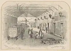 The original Sydney station was opened on 26 September 1855 in an area known as Cleveland Fields. It was a temporary timber and corrugated iron building, constructed rapidly in late August to early September 1855, in time for the opening of the line to Parramatta for passenger trains.[4]