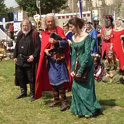 The Pentecôte du Roi Arthur is a medieval spectacle with jonglerie, storytellers, camps, storytelling, camps and other displays such as historical reenactment and living history.[39] As the name suggests, it coincides with the date of Pentecost. It is a celebration of spring and the adventures and encounters which it brings,[40] but most importantly (according to Ouest-France) it is an evocation of King Arthur's coronation day (as described by Robert de Boron in the 13th century) and his commitment to the Church. It was also on Pentecost that the Holy Grail appeared to the Knights of the Round Table.[41]
