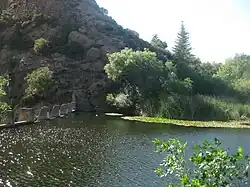 In 1903, wealthy Angelenos belonging to Crags Country Club[1] created the 50-foot-tall dam in order to make a seven-acre hunting and fishing lake, Century Lake, for their country club.[2][1] The club went bankrupt in 1936,[1] and in 1946, 20th Century Fox bought the lake and a big swath of the surrounding land to film movies.[2] In 1968, Planet of the Apes used the lake for filming.[1][3]