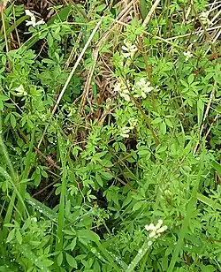 This delicate looking plant is a hairless annual (or occasionally perennial) up to a metre tall with weak, often pinkish, clambering stems. The leaves are pale to medium green, doubly compound, the leaflets being well-stalked and divided into three to five sub-leaflets, and ending in a branching tendril. It blooms between May and September in the UK.[3] The flowers are small, about 6 mm (0.24 in) long,[3] pale creamy-yellow, in short axilliary spikes. Each flower is elongated and tubular with a lip and spur and stamens in two bundles. The seed pods are short, usually narrowing between the two seeds.[4]