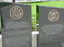 The memorial was dedicated at the first annual Veterans Day ceremony on November 11, 2006.It features a 20-foot-high (6.1 m) stainless steel sculpture in the shape of a flame atop a reflecting pool. There are five pedestals surrounding the pool, each containing the emblem of one branch of the United States armed forces: Army, Navy, Air Force, Marines, and the Coast Guard. Off to the side, there are two other pedestals, one in honor of the Merchant Marine, and another honoring all 32 groups who were recognized by Congress for their efforts during World War I and World War II.