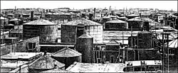 By 1874 there were 123 refineries in what would become known as "Black City".[4] The refinery district was about 8 miles (13 km) from the shipping ports.[5] An industrial area plan was completed in 1876. Some of the farms and pastures of the neighbouring village of Keshla were zoned to accommodate replacements for factories that had been dismantled in the city. The new industrial zone was 2 kilometres (1.2 mi) from residential areas. To prevent further pollution, the new zoning law prohibited oil refineries from being built within the residential area.[3] By 1880, there were 118 industrial businesses functioning in the Black City area.[3]