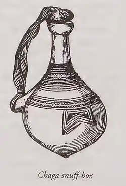 Wood was the primary material for the Chagga's domestic items, allowing them to create a variety of containers, including small bowls and large tubs for beer feasts. Their wooden spoons, ladles, and "teaching sticks"—used in initiation ceremonies—sometimes featured incised designs. While the Chagga did not produce pottery due to a lack of clay, they acquired pots through trade. They also lacked iron but had skilled blacksmiths who shaped iron obtained via barter, producing tools such as hoes, sickles, spears, knives, and decorative items like bracelets and necklaces.[46]