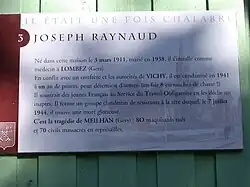 A small plaque celebrates the birth of Joseph Raynaud in 1911. He went on to join the local Maquis in the Gers and was executed by the Germans on 7 July 1944.[4]