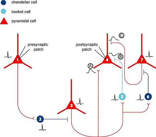 An action potential in a pyramidal neuron (cell 1) elicits a spike in a chandelier cell (2) via a strong connection, in turn evoking a third-order spike in a downstream pyramidal cell (3). This spike results in a trisynaptic EPSP being recorded in a postsynaptic pyramidal cell (cell 4, event A). At the same time, cell 3 drives both a basket cell (5) and chandelier cell (6) to threshold. The basket cell evokes a hyperpolarizing IPSP on the postsynaptically recorded pyramidal cell (cell 4, event B), four synapses removed from the original spike. The spiking chandelier cell (6) triggers yet another pyramidal neuron to fire (7), which produces an EPSP on the recorded neuron (cell 4, event C), five synapses away from the original spike. The result seen in the postsynaptic pyramidal neuron (cell 4) is a delayed EPSP-IPSP-EPSP sequence (events A, B, and C), traveling through three, four, and five synapses respectively. Molnár et al. propose[2] that polysynaptic pathways similar to this one can be activated by a single action potential in a cortical pyramidal cell.