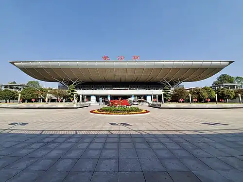 Changsha South railway station (simplified Chinese: 长沙南站; traditional Chinese: 長沙南站; pinyin: Chángshānán zhàn) is a metro station and a railway station of Wuguang Passenger Railway and Hukun Passenger Railway. The station is located in Lituo Subdistrict, Yuhua District, Changsha, Hunan, China. It is a hub and the connecting point of Beijing–Guangzhou–Shenzhen–Hong Kong High-Speed Railway, Shanghai–Kunming High-Speed Railway and the proposed Xiamen-Changsha-Chongqing High-Speed Railway. The station was opened on 26 December 2009.