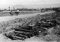 As they were leaving Damascus by the Bab Tuma, the 10th Light Horse Regiment learned that rearguards held the Nahr Ma'raba about 5 miles (8.0 km) north east of Damascus. The leading squadron supported by the regiment attacked the German machine gunners who were eventually forced to abandon their position "when [the rearguard] ... saw that the attack was about to be pressed home" by a cavalry charge.[23] The Wadi Ma'raba rearguard was captured by 09:00 along with 600 prisoners and about 40 machine guns.[28][29] The Australian light horse regiment was followed through Damascus and the Bab Tuma gate at 10:30 by the 14th Cavalry Brigade (5th Cavalry Division) which established outposts and gained touch with the 13th Cavalry Brigade (5th Cavalry Division) which had advanced round the east side of the city to the Homs road.[16][30]