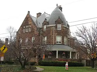 The Charles B. Russell House (also known as the "Duffel Building") is a historic residence in the Clifton neighborhood of Cincinnati, Ohio, United States. Built in 1890,[1] it is a large two-and-a-half-story house constructed primarily of limestone. Multiple windows, including several dormer windows, pierce all sides of the turret, while another large dormer window with Palladian influences is present on the house's southern side. A common theme in the design of the house's windows are string courses of stone that connect the windows and voussoirs that radiate out from the windows to many directions. Among its most distinctive architectural elements are the heavy stone front porch, which transitions from a verandah on one end to a sun porch on the other end, and the large circular turret on the front corner of the house, which is capped with a beehive-shaped pinnacle.[2]