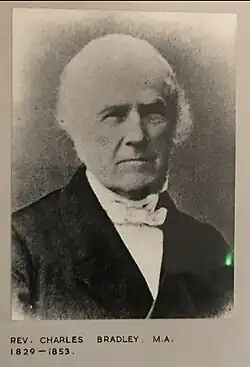 Bradley belonged to the evangelical school of the Church of England. He was born in Halstead, Essex, on 22 February 1789. His parents, Thomas and Ann Bradley, were both of Yorkshire origin, but settled in Wallingford, where their son Charles, the elder of two sons, passed the greater part of the first twenty-five years of his life. He married, in 1809, Catherine Shepherd of Yattenden, took pupils and edited several school books, one or two of which are still in use. He was, for a time after his marriage, a member of St Edmund Hall, Oxford, but was ordained on reaching the age of 23, without proceeding to a degree, and in 1812 became curate of High Wycombe. Here for many years he combined the work of a private tutor with the sole charge of a large parish. Among his pupils were the late Mr. William Smith O'Brien, the leader for a short time of the so-called national party in Ireland; Mr. Bonamy Price, professor of political economy in the university of Oxford; and Archdeacon Jacob, well known for more than half a century in the diocese and city of Winchester. His powers as a preacher soon attracted attention. He formed the acquaintance of William Wilberforce, Thomas Scott, the commentator, Daniel Wilson, and others; and a volume of sermons, published in 1818 with a singularly felicitous dedication to Lord Liverpool, followed by a second edition in 1820, had a wide circulation. The sixth edition was published in 1824, the eleventh in 1854.