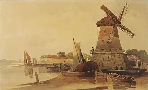 Calvert originally apprenticed in the cotton trade, and he worked as a merchant for a short time "in accordance with the wishes of his friends" before deciding to pursue landscape painting as a career.[16][17] Notices announcing the dissolution of Calvert's cotton merchant partnership with Michael Gibson appeared in newspapers in December 1810; the earliest works attributed to him today date from the early 1810s.[18][19][20]